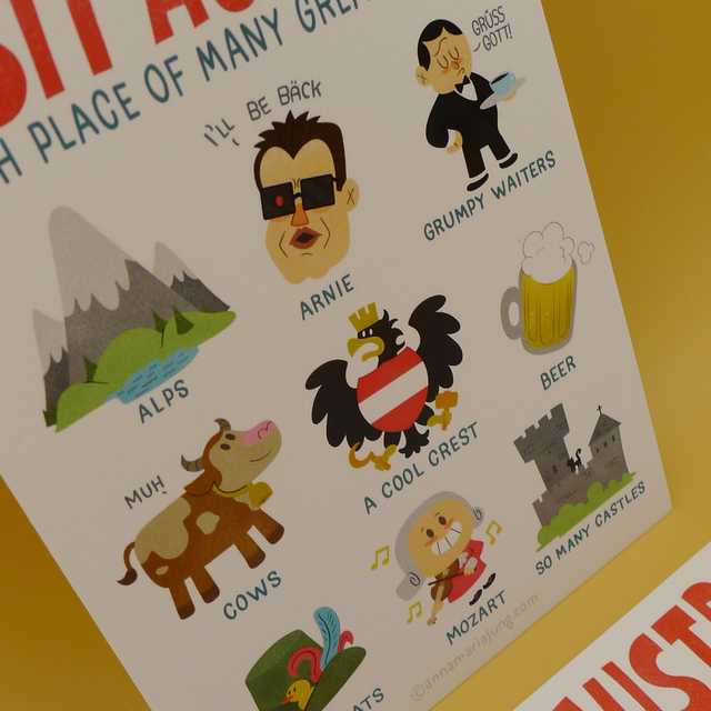 After a trip to Denmark, I discovered the charming retro art of IB Antoni, which he created to celebrate his homeland. Inspired by his work, I set out to create something similar for my hometown of Graz. Since 2014, I’ve designed around 15 cards featuring iconic sights, foods, and landscapes that Austria is known for. These cards have sold over 20,000 copies and are being sent around the world by happy tourists.